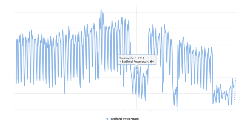 The Demand Tracker relies on synthetic aperture radar (SAR) technology to assess the occupancy ratio of parking lots, whether they’re reserved for employees or for inventory. It also relies on daily geolocation data, and is able to provide a range of activity metrics such as a traffic index, number of hours spent on the ground, etc.